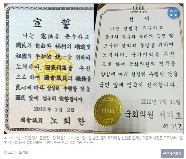 "19대 국회 개원 날, 거의 대부분 당선자들이 금빛 찬란하게 펼쳐나갈 4년을 머릿속에 그리며 국회의원 선거를 하고 있는 동안, 재선의 통합진보당 노회찬 의원은 선서문이 한자어로 점철된 것에 심각한 문제 의식을 갖습니다."