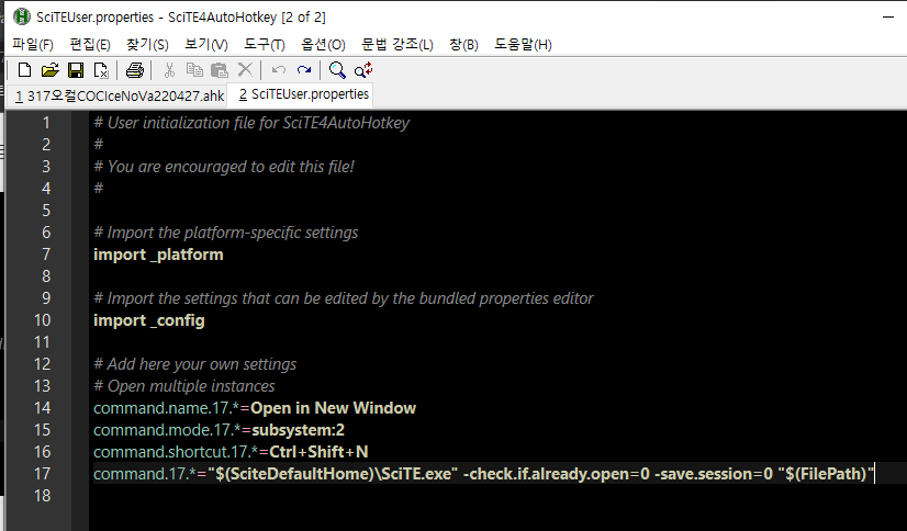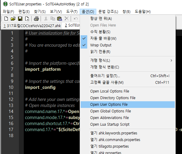1. SciTE4AutoHotkey의 옵션에서 Open User Options File을 클릭하면