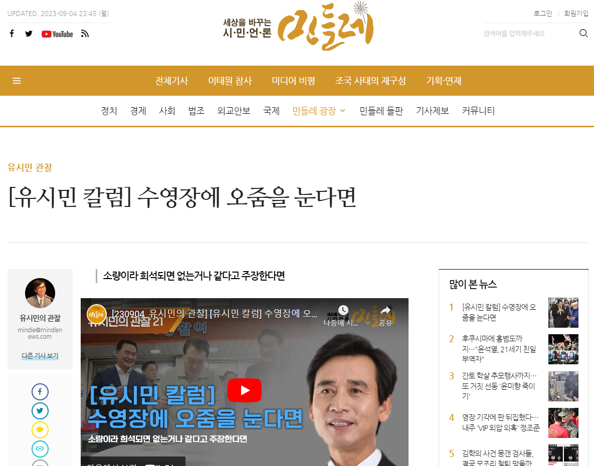 나는 해산물을 즐긴다. 김과 미역 같은 해초도 좋아하고 생선은 회부터 구이와 졸임과 탕까지 모두 사랑한다. 일본이 오염수를 방류하고 있지만 해초와 생선 먹기를 포기하지는 않을 생각이다. 그렇지만 찜찜함을 버리지는 못하겠다. 방사능 피폭에 대한 두려움보다는 더러운 물에 대한 거부감이 더 크다. 공공 수영장에 오줌을 누고서도 미안한 표정조차 없는 일본 정부가 밉다. 일본 정부를 비판하는 이들을 가리켜 반일감정 선동하는 ‘공산전체주의 추종자’라고 험담하는 우리 대통령한테는 ‘밉다’라는 말로도 부족하다.