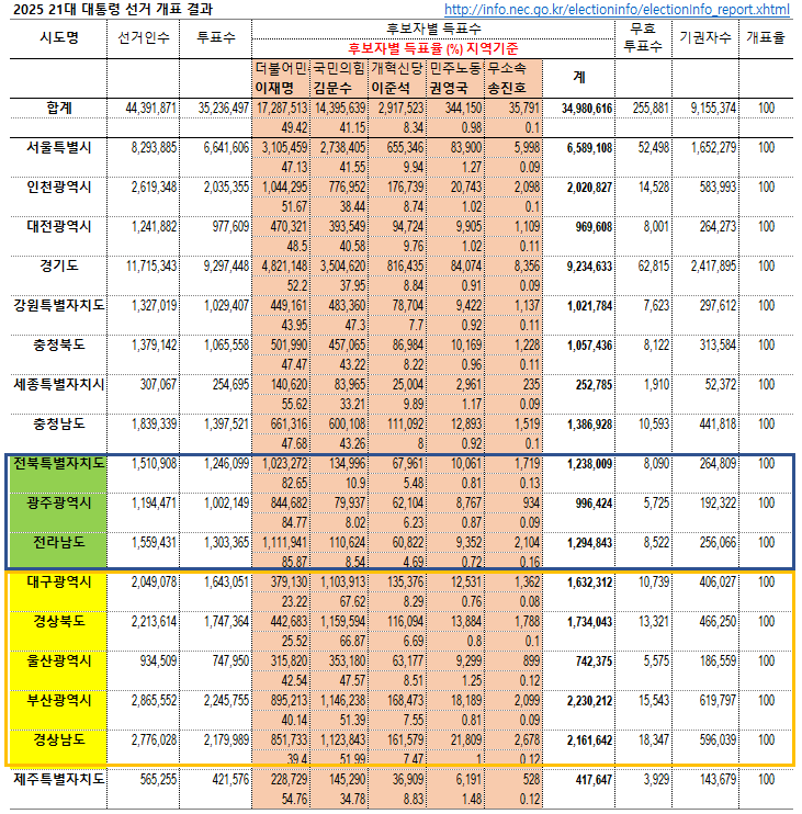 --> 전라도 전체 투표수 3,551,613, 경상도 투표수 8,564,109(241%) 차이때문